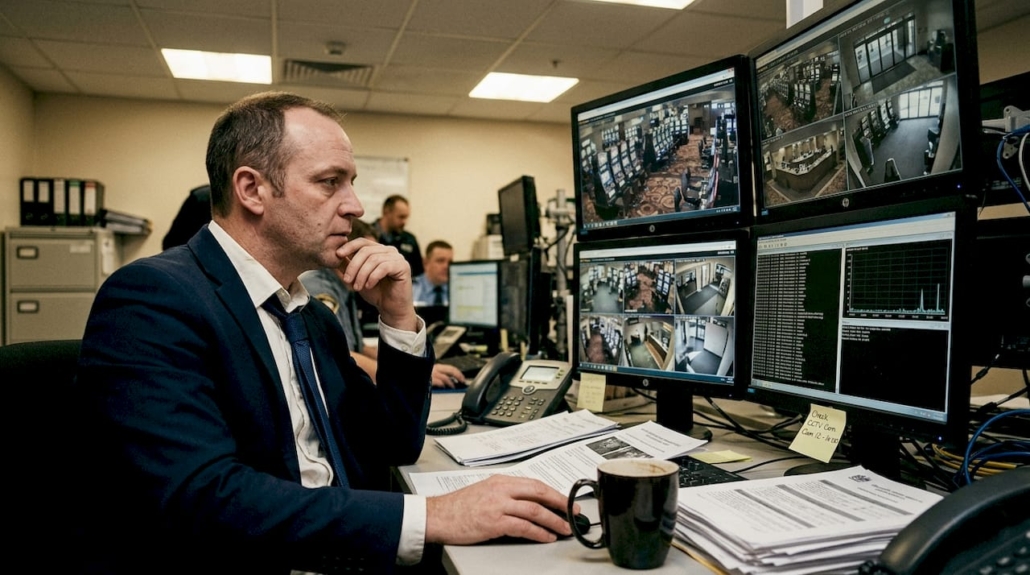 Casino security manager monitoring screens